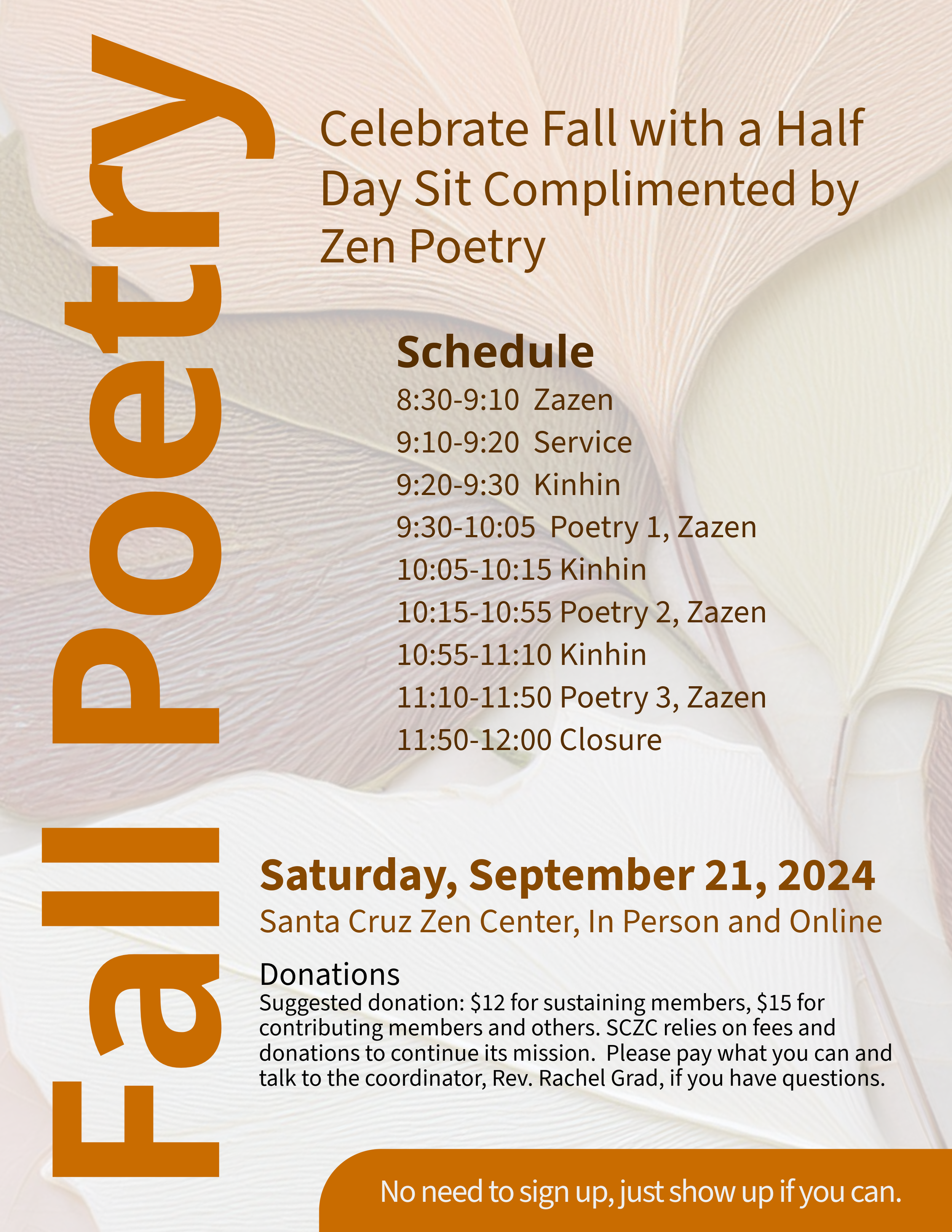Half Day Sit: Fall Poetry - Scheduled for Sat, Sept 21 with Rev. Rachel Grad SCZC AdminAugust 30, 2024 0 Likes